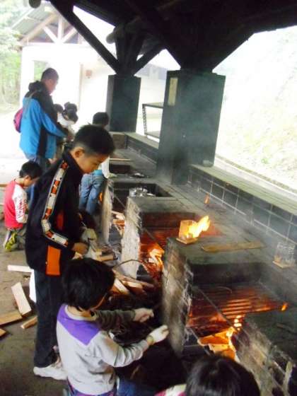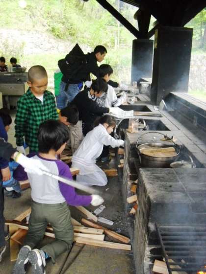 さて、火が起こせた子供たちは、夕飯の準備にかかります。起こした火で、マキに火をつけるのが一苦労。でも楽しみながら一生懸命取り組む姿に思わず微笑んでいる私(初田)でした。