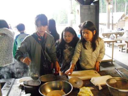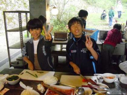 食材を調理する子供たちも楽しそう。お家ではお手伝いしてるかな? たずねてみると、女の子は案外「お手伝いしてます。」という答えが多く驚きました。道理で手さばきが堂に入ったもの。男の子も負けてられないと奮闘していました。