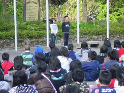 朝の集いが始まりました。一緒に合宿している各学校が学校紹介をしました。開睛館の代表もしっかりと紹介してくれました。