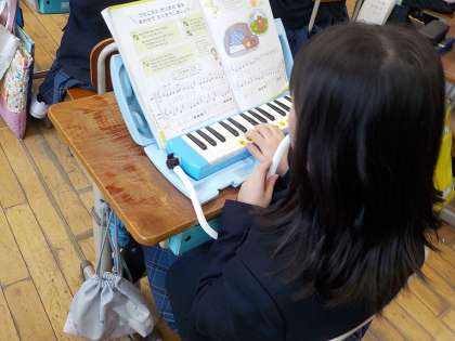 鍵盤ハーモニカで演奏するパートを分け、歌う人と役割を分担して演奏と歌を楽しみました。音を重ねて演奏するのが楽しくて、何度も歌ったり演奏したりしました。もっと上の学年になると、音を重ねたりするのがもっと難しくなったりするのかな?