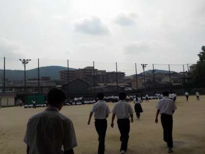 グランドに避難集合しつつあるところです。