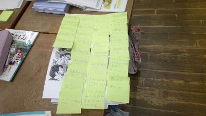 何度縄に引っかかっても挑戦し続け、30回跳ぶことに成功した時の3年2組の気持ちを考え、付箋にかいてグループで交流しました。