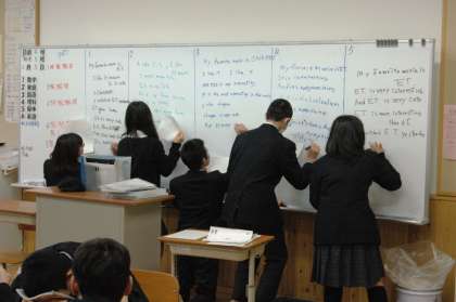 8年は争うように白板に英語で書き込んでいるところに出くわしました。8年生の英語の学力はすごく伸びています。これからが楽しみです。