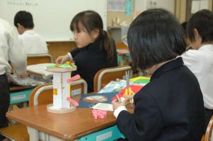 これはまわって転がるおもちゃをつくる学習です。転がることによって,飾りがひらひらしたり,色が変化したりする様子から,美しさや面白さに気付くようにすることをねらっています。また色の使い方や紙の貼り方,形の切り方など,工夫できるようにしています。子どもたちは,転がしてみながら,作品作りを楽しんでいます。