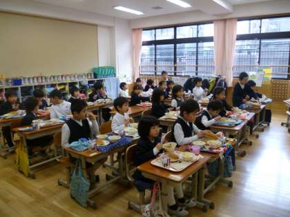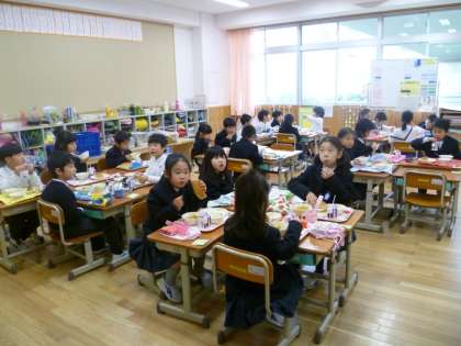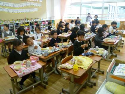 1年生の教室で勉強するのも,あと2カ月足らずとなりました。2年生になったら,新しい学級になります。そこで,今まで同じクラスでなかった友達とも仲良くなるために,1年生のクラスを解体した「交流給食」を毎週水曜日に行っています。今日はその3回目。自分のクラスでない教室で食べている子どもは少し緊張気味です。