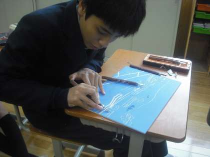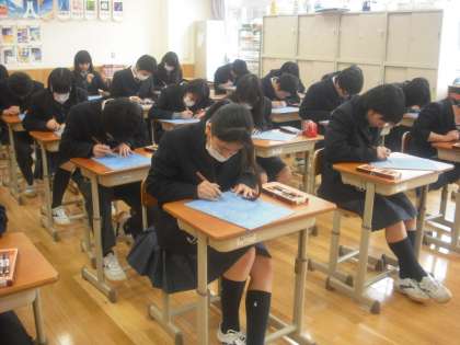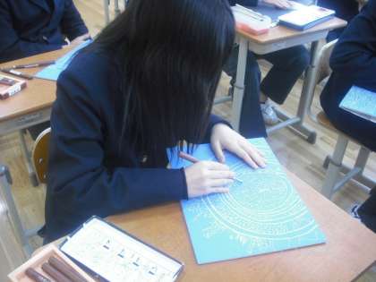 題材は,「わたしの大切な風景」です。地元に目を向けさせて,自分にとって大切な風景を版に表しています。友だちとの帰り道の風景や,幼かった頃に遊んだ公園・お世話になった地域の風景…。一人ひとりが思いをこめて制作しています。