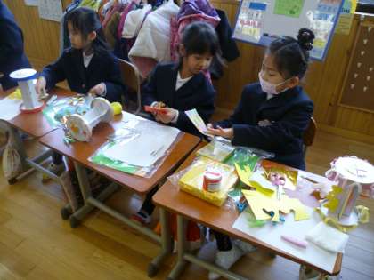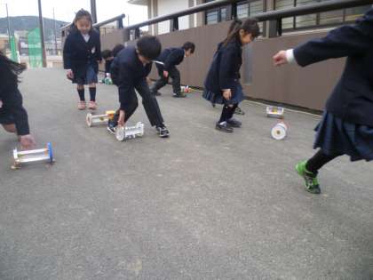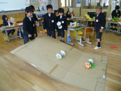 楽しく制作してきた作品が,仕上がってきました。教室内に,ダンボールで坂を作って,試しにころがしてみて,作品を完成させました。