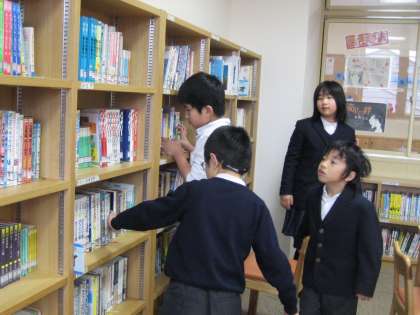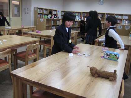 メディアセンターで,「宝さがしゲーム」をしました。6年生のリーダーが,紙で作った宝物を本棚などにかくして,皆で時間内に見つけ出し,得点を競います。低学年が見つけられるように,また高学年用に少し高い所に隠すなど活動が始まる前から,工夫して準備をしてくれました
