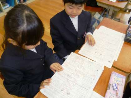 葉で説明します。二人組で伝え合い,最後には自分でプリントに書いていきました。