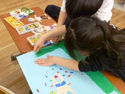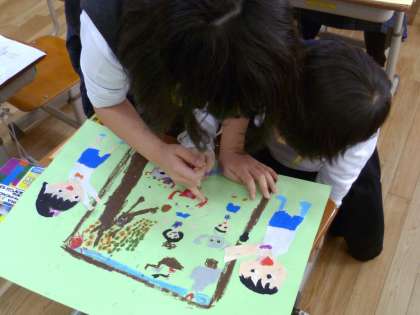 板にはります。みんなで話し合いながら,作品を仕上げています。