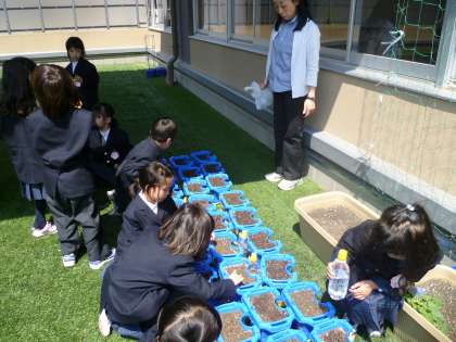 一人ずつが自分の植木鉢に,土を入れて,小さなあさがおの種を植えました。