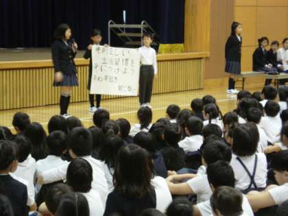 今日は、計画委員が中心となって児童朝会を行ないました。
