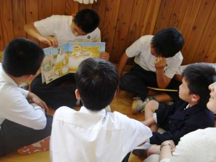 6年生が、2年生の机・いすの高さ調整を手伝ったり、読み聞かせをしたりし