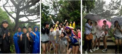 雨をおして城山に登った面々。すっかり雨に濡れてしまったようですが,みんな笑顔です。