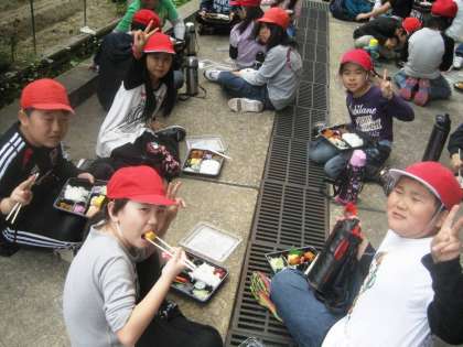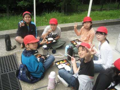 ドッジビーを楽しんだあとはみんなでお弁当を食べました。みんなで食べ