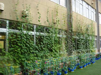 5月に植えたゴーヤやアサガオなどのグリーンカーテンがすくすくと育ち、