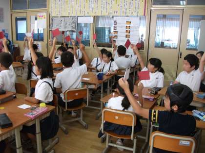 最初からにこにこの竹口君と4年生のみんな。紙相撲をしたり一緒にダンスをおどったり、どんどんおたがいのことがわかりあえてきました。今日は「竹口君クイズ」をして,もっともっと竹口君のことや学校の様子を知ることができて,とてもうれしい時間でした。