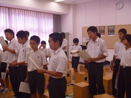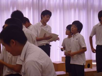 「指揮者上手やなあ」「もっと声でるよ」8年生が6年生の合唱を聞いてアドバイスをしてくれています。初めてクラスで合唱コンクールに出場する6年生に8年生が,とてもていねいに指導しています。