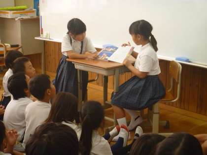 (メディアセンターから借りたのかなあ)(このシリーズがきっとお気に入りなんだな)そっと教室に入ってみると,3年生は図書係がクラスのみんなに読み聞かせをしています。友達が読み聞かせをしてくれるのも大好きなみんなです。「次は何の本かなあ」と今から楽しみです。
