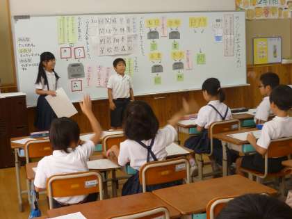 2人組でクイズを考え,前に出てみんなにクイズの出題をします。