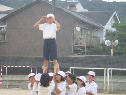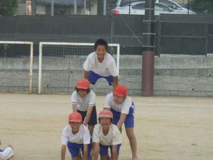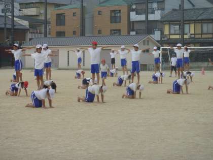 「よし」「いくぞ」子ども達の心の声が聞こえてくるようです。グランドで組体操2回目の練習をしている6年生です。アリーナと違って足もひざも痛いけれど,アリーナと違って砂がいっぱいつくけれど,子ども達は笑顔です。きっとそれは,今までひとつひとつ学年みんなで取り組んで,ひとつひとつの技をていねいに完成してきた自信からです。曲に合わせての動きも見ているとすごく難しいのですが,心ひとつに取り組んでいるから,ものすごくスムーズです。