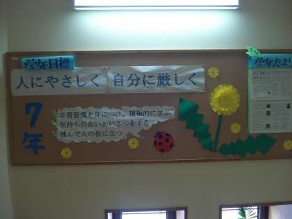 本日の学活では、学級目標の決定、学級旗の制作について各学級で取り組みました。7年の学年目標は「人にやさしく 自分に厳しく」です。自分を律し、人を思いやれる生徒に育ってほしいと想いをこめました。この学年目標を受けて、各クラスで目指すクラス像を話し合いました。それぞれのアイデアを出し合い、少しずつ形になってきました。来月の生徒総会にむけて、学級旗制作を進めたいと思います。それぞれの想いが詰まった、学級目標、学級旗となるよう気持ちを一つにして取り組んでいきたいと思います。