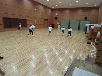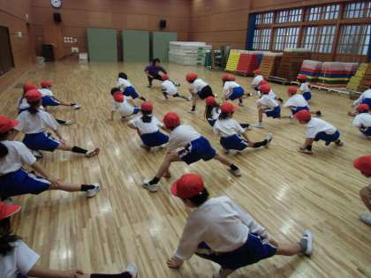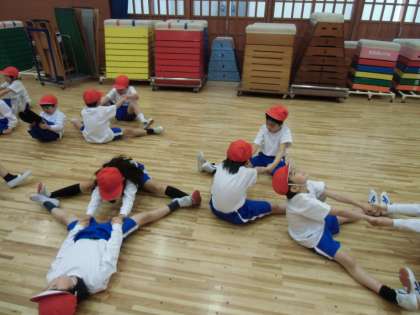 1年生は開睛館の地下2階にある武道場で体育をしました。いつも体育に出るのは中庭だったため,子どもたちからは戸惑いの声が上がりました。「せんせいー,下靴はもっていかないんですかー??」そう今日は違うのです。武道場ではからだほぐしの運動をしました。端から端まで列ごとに走ったり,横向きにかにさん走りをしたり,足を開いてお互いにストレッチをしあったり体のいろいろな部分に意識を配りました。子どもたちも体育は大好きなようで教室では見られない,非常に活き活きとした様子で授業をうけていました。