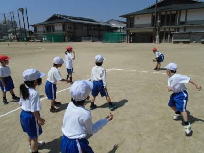 武道場の次はグラウンドで1年生が体育の授業をしました。内容は「ころがしどっちぼーる」です。ルールやボールの転がし方を練習し,枠の中にいる子どもたちにむかってボールを転がします。片手で投げるのは難しいところもありましたが,全員がボールを投げたりよけたりしながらゲームを楽しみながら学習できました。