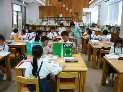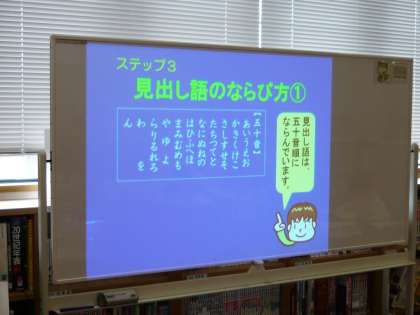 ホワイトボードには使い方が映写されていました。なるほどいろんな事柄が五十音順に並べてあるのですよね。しっかりお勉強をしてわからないことを一人で調べられる子になりましょうね。3年生の学習でした。