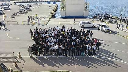 乗船・出航です。伊江島での思い出を心のバッグに詰め込んで一行は沖縄本島に向かいます。14〜15歳というこの頃の出来事は不思議と覚えているものです。伊江島でのこの間の出来事も一生残る思い出となることでしょう。伊江島の皆様、ありがとうございました。
