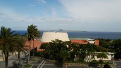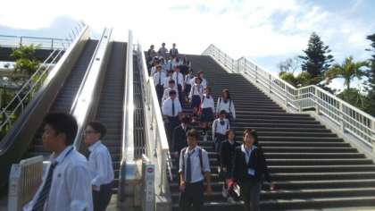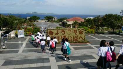 本部到着後バスに乗り換え、一行は海洋博公園に到着したようです。美ら海水族館にむかっている写真です。マンタに会えるかな?