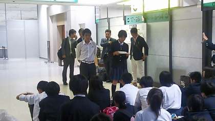 解団式。出発の時の結団式からだいぶ経ったような気がしているのかもしれません。N・Y君とK・Cさんの司会のようですね。よくある言葉ですが「家に帰るまでが修学旅行です。最後まで気を付けて帰りましょう。」なんて言っているのでしょうか。