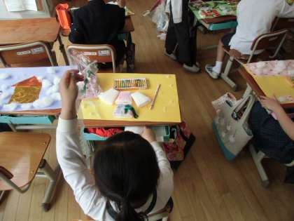 2年生の教室の前には,今乾燥棚があります。そこに子どもたちが図画工作で制作している作品が置かれています。身の回りのいろいろなものを使って画用紙に自由に構想をするというものです。子どもたちは多彩にひもやモール,包装紙などを用い,作品を制作していました。大人もどう使うのか悩んでしまいそうなものを,上手に用いている子どもももいました。