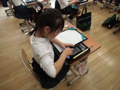 3年生が今日使うのは,絵の具セットではありません。初めて習字道具を用いて,書写の学習をします。最初は習字セットの中身の確認です。必要なものはきちんとそろっていましたか?道具の確認が済んだあとは,筆の持ち方を全員で確認し半紙に筆で「一」の文字を練習しました。初めに水で,墨をすって,墨汁でと違った書き心地を学びました。筆を使って文字を書くのが初めてで緊張している子どももいました。手をぷるぷるさせながら,最初は恐る恐る筆を走らせていました。