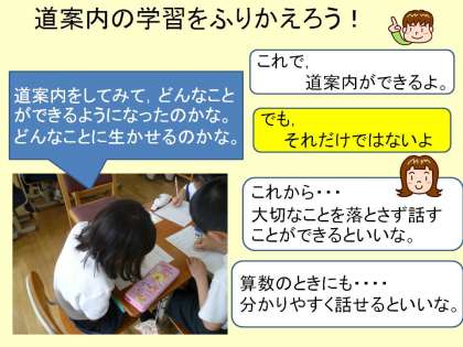 でも,この学習は,単に「道案内名人」になることをねらうのではなく,道案内に必要な力が,実は,他のさまざまな学習の場面や生活の場面で役立つことに気付いてほしいのです。