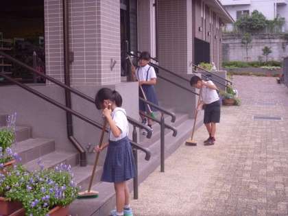 「すみずみまで,砂をとってるね。そのほうきの使い方、上手」校門は学校の顔です。