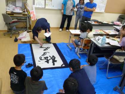 道具の説明や筆の使い方などをお話していただいてから,練習を始めました。子どもたちは,自分の名前や好きな文字を書いて,色紙に貼って作品が完成しました。先生のパフォーマンスもありました!