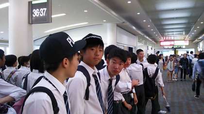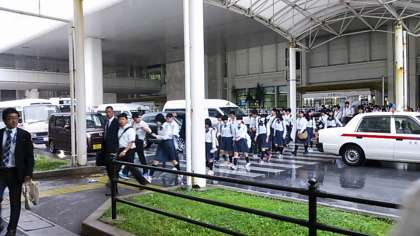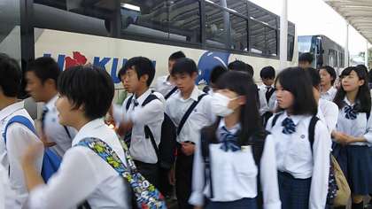 飛行機から降り→雨の中をバスに向かい→バスに乗り込む様子です。急いでバスに乗り込もうとするせいか、あまり笑顔が見られません。笑顔の横顔の女子生徒を見つけ少しほっとしたのは、「雨のせいでがっかりしているのかなあ」と思った矢先にその笑顔を見つけたからなのだと思います。