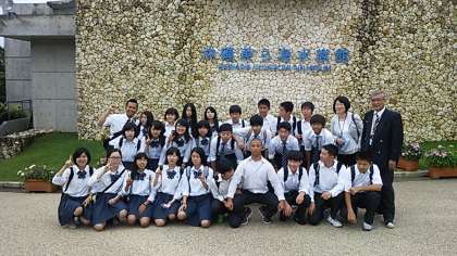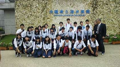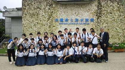 雨は本部に近づくにつれ弱まってきて、傘なしで写真が撮れるくらいまでになっているようです。美ら海水族館で学級写真です。