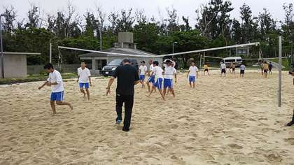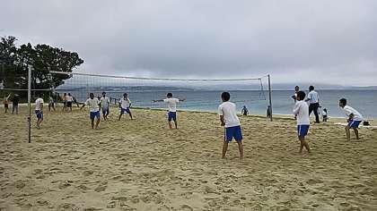 レクレーションの様子です。沖縄のビーチで学年で集まりレクレーション・・・一昔前の修学旅行では考えられない一コマです。黒い服を着た,間もなく還暦を迎える中学生も奮闘中。怪我をしないように気を付けてくださいね。