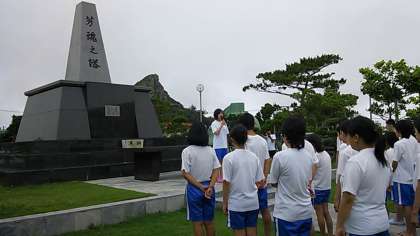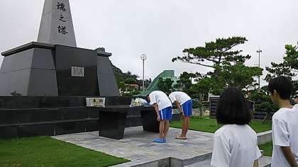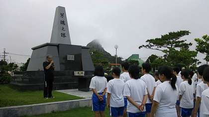 芳魂の塔の前での平和セレモニーです。厳粛な雰囲気の中、心のこもったセレモニーができました。生徒たちは,盛り上がったレクレーションからしっかりスイッチを切り替え,大変立派な態度で臨んでいました。これからまた、各民家さんに戻って、海に泳ぎに行ったり、観光を楽しみます。