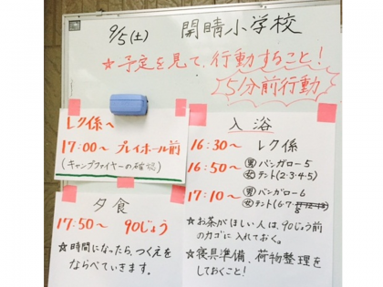 現在の様子と今後の予定が届きました。入浴を3回に分けて入ります。夜のキャンプファイヤーの係は1番はじめに入り、レクレーションの練習に励んでいます。入浴を待つ子や入った子は、90畳で荷物整理をしたり、寛いだりしています。