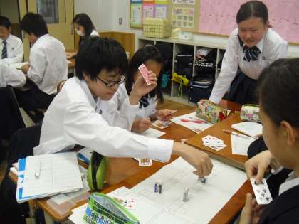 アクティブラーニングとは、講義形式ではない生徒参加型・生徒主体型の授業のことで、最近ではアクティブラーニング用の部屋やスペースがつくられている高校や大学もあります。これは数学の授業で、生徒はスゴロク形式で正の数・負の数の学習を自分たちで進めています。こんな授業なら、数学が好きになるかも…