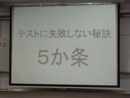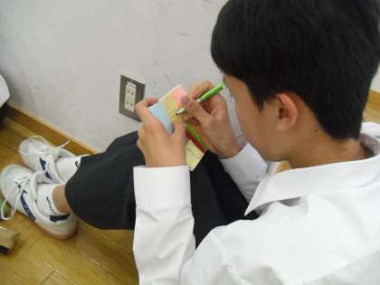 中学生になり初めての定期テストまで2週間を切ったということで、テストに向けての心構え、学習計画の立て方、1日の時間の使い方などの話をしました。中学校の定期テストがどのようなものかイメージが持てていない生徒もいるので、集会後にクラスに戻り学習計画を立てることで、学習への意識を高めてもらいました。集会では、熱心にメモをとる生徒もおり、やる気の一端を感じました。