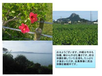 午前中は各民家での体験活動。午後からは伊江ビーチで学年レクレーション。その後、民家での体験学習になります。