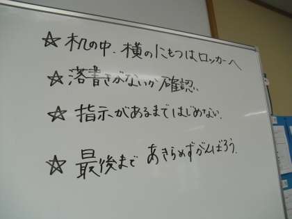 学生生活で試験を避けて通ることは出来ません。今日の第1回テストは、これから受けなければならない多くの試験の最初の一歩を踏み出したことになります。そして、その先には高校の入学試験があります。嬉しかったことは、誰も欠席、遅刻をしなかったことです。全員スタートラインに無事立てたことはなによりです。試験での健闘を祈ります。