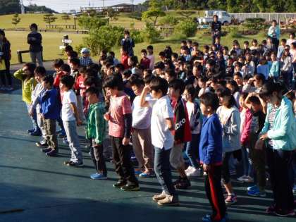 日差しが暖かい二日目を迎えました。朝一番の活動の朝のつどい&学校紹介がはじまりました。伏見住吉小学校の四年生との交流でした。お互いの校歌を歌ったり、学校の良さや地域について交流したりしました。