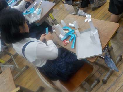 図画工作科でビー玉が転がるコースをつくりました。題材のはじめに曲がり角やカーブなどの作り方を学びました。その後、コースを様々に組み合わせたり、飾りをつけたりして、自分のイメージに合う作品を作りました。
