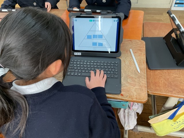 国語科の学習で、「困ったときに助けてくれるこんなロボットがあったらいいな」という理想のロボットを考えました。ピラミッドチャートを使って考えを整理しました。