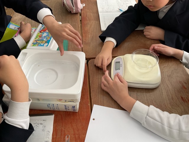 電子てんびんを使って、わいわいと和やかな様子で実験をしていました。